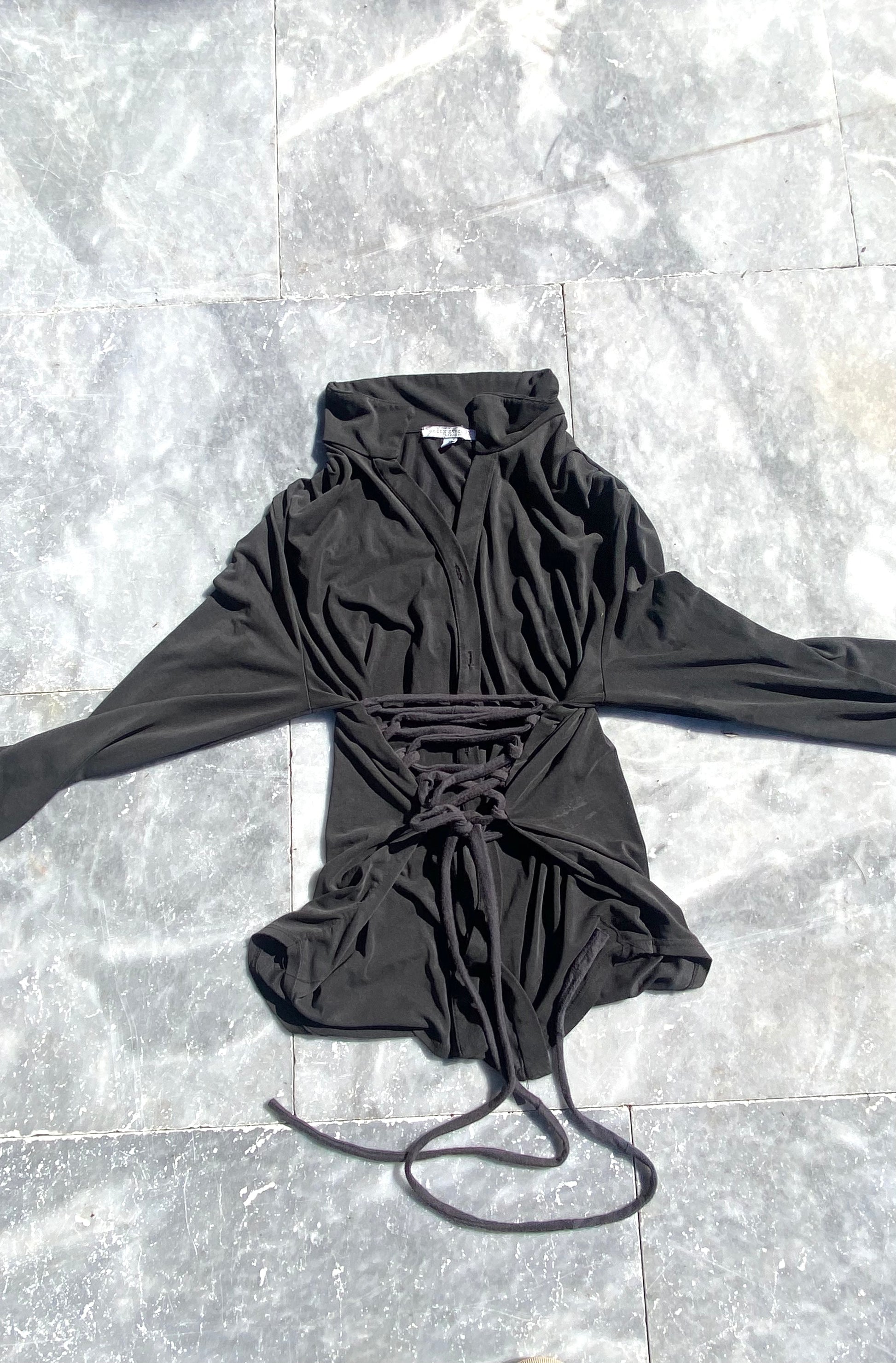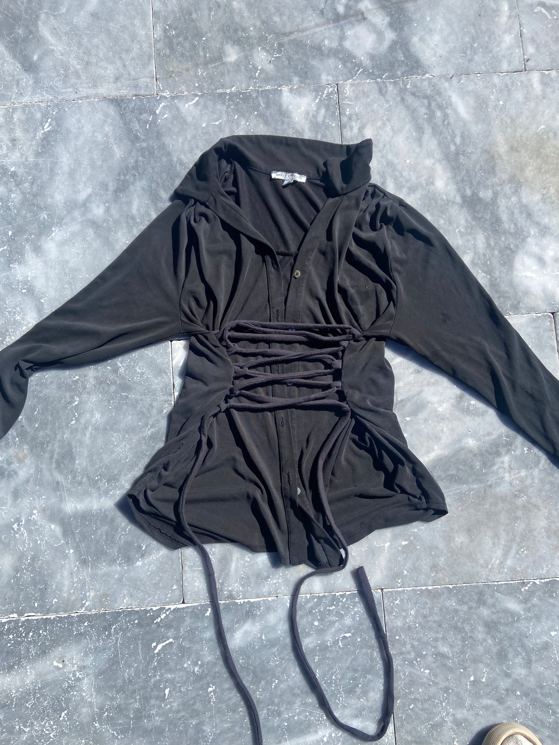 Recommend if you are small/medium so it will look oversized and hang correctly for the corset. Some minor (grease?) stains at the top but not that noticeable. Could probably take off with baking soda. Please note that all items are hand made/reworked out of second hand fabrics. Minor wear and tear is to be expected. The size tag might not always be accurate therefore always check the measurements before purchasing to make sure the item is going to fit you.